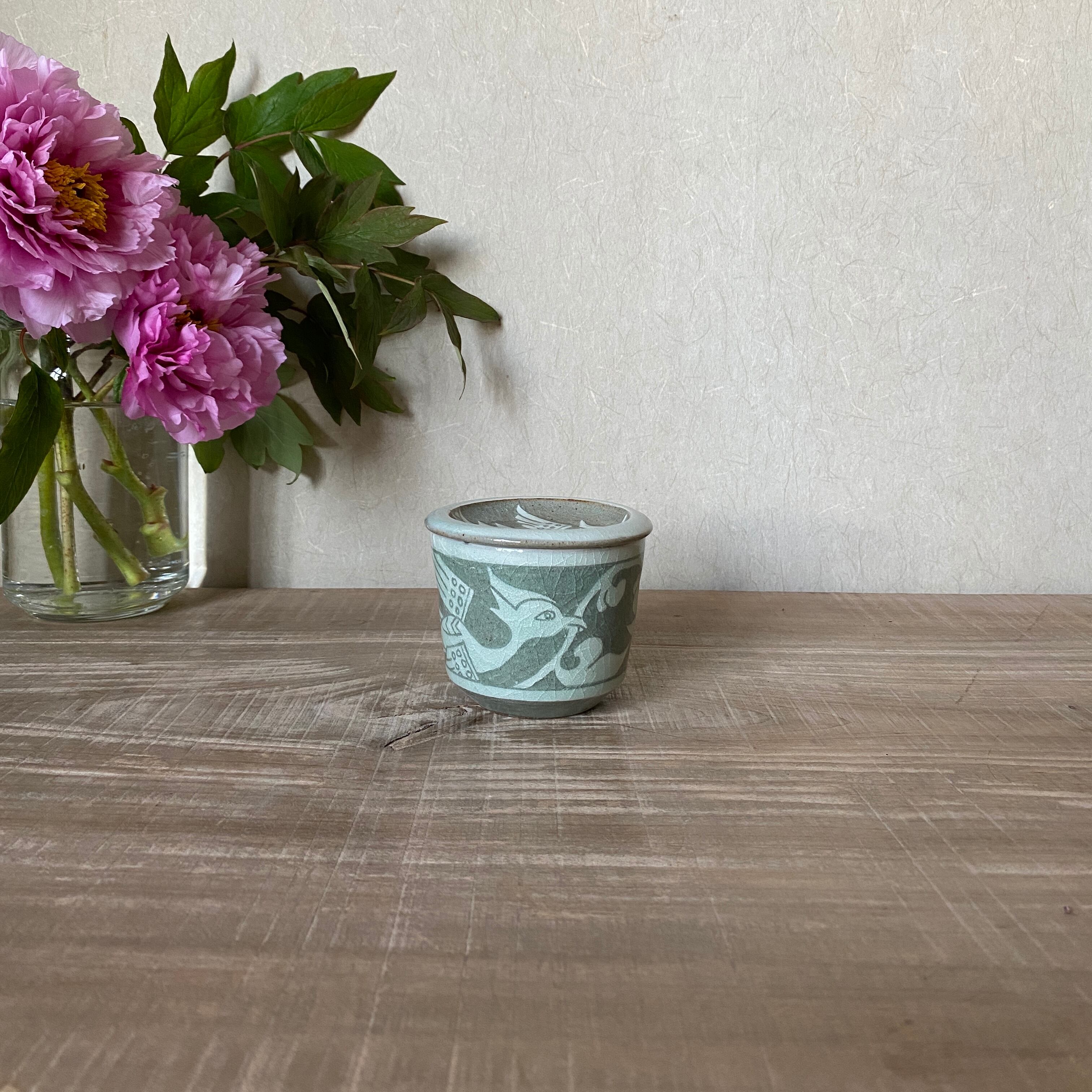 掻落鳳凰(青磁)そば猪口 (蓋鳳凰)